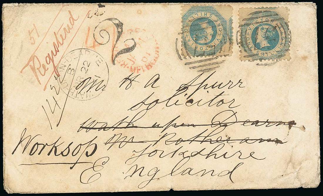 1861 (23 Jan.) envelope from Kyneton to Rotherham and redirected to Worksop, bearing Octagonal perf 12 1/- (2) tied by Barred Numeral "57", showing "registered/melbourne" c.d.s. in red overstruck by handstruck "2" applied upon redirection and, on reverse, despatch and transit datestamps; the envelope a little soiled and creased. Photo