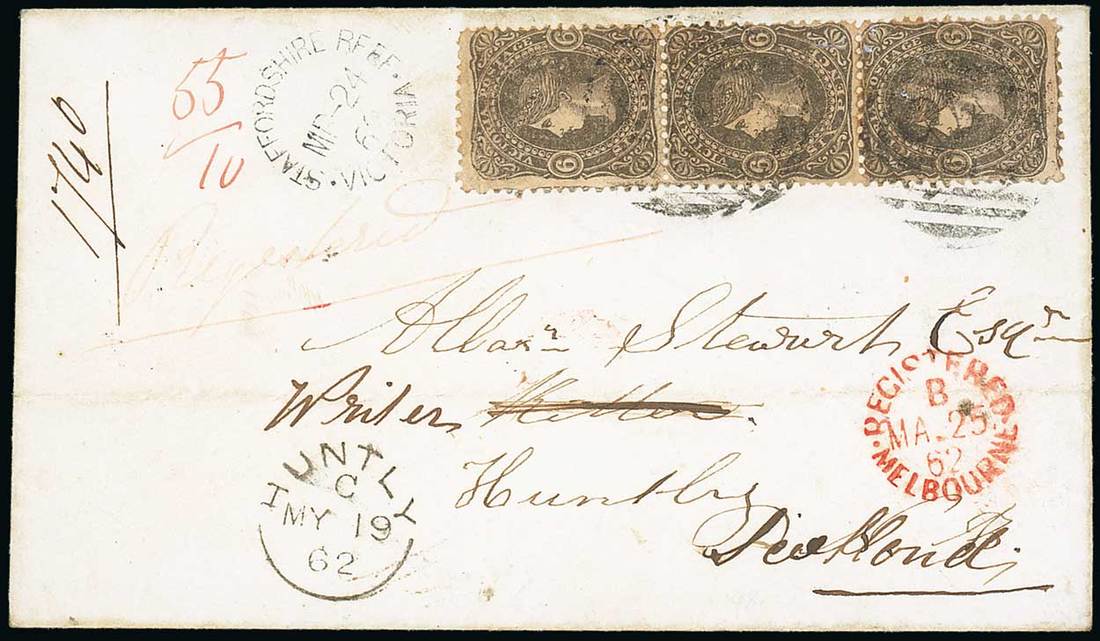 1862 (24 Mar.) envelope from Staffordshire Reek to Scotland, bearing Beaded Oval 6d. black vertical strip of three tied by Barred Numeral "375", showing despatch c.d.s. alongside, "registered/melbourne" c.d.s. in red and Huntly arrival d.s. (19.5). Photo