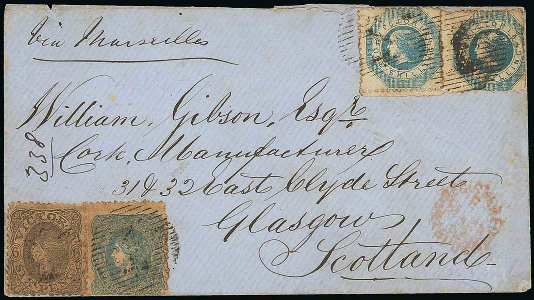 1862 (Sept.) envelope from Melbourne to Glasgow, marked "Via Marseilles", bearing Octagonal perf 12 1/- (2), Beaded Oval 3d. (straight edge at foot) and Adapted 6d., all cancelled by "1" in bars, showing legible "registered/melbourne" c.d.s. in red with arrival d.s. (14.11) on reverse; the envelope with tears on reverse which do not affect appearance. Photo