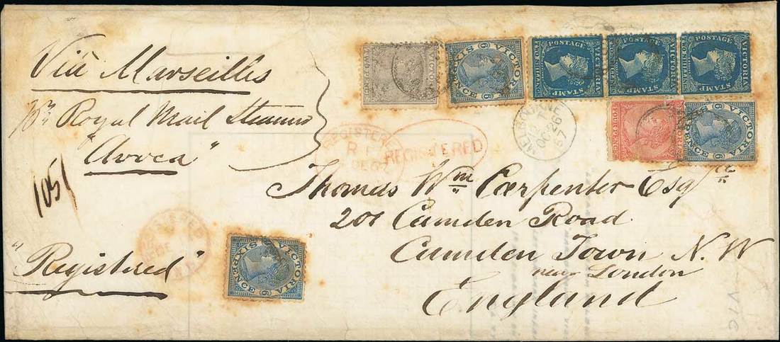 1867 (26 Oct.) envelope (270x105mm.) from Melbourne to London, marked "Via Marseilles, pr Royal Mail Steamer Avoca", bearing Woodblock 2/- vertical strip of three with Laureated 2d., 4d. and 6d. (2), all indistinctly cancelled, showing Melbourne c.d.s. plus oval-framed "registered" and arrival Registered d.s. in red; the adhesives all with faults/defects including staining, nevertheless a remarkable franking for a letter between 4 and 4½ ounces. Photo