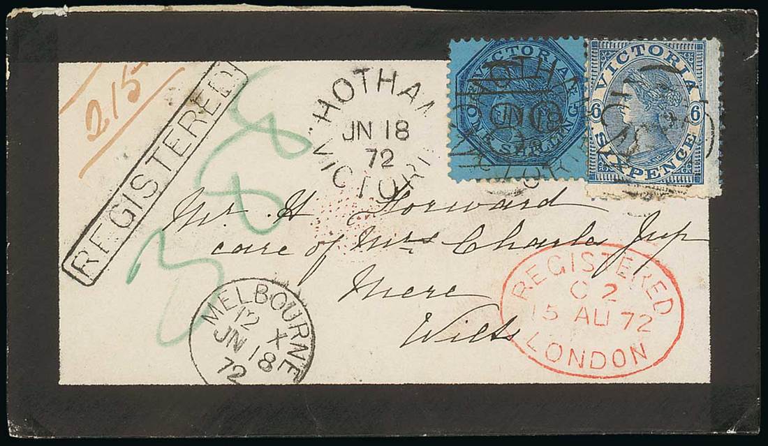 1872 (18 June) mourning envelope to Mere, Wiltshire bearing Laureated 6d. and 1/- tied by Hotham "289" duplex, showing framed "registered" with Melbourne and red London Registered (15.8) transit d.s.; the envelope with two pinholes at upper left. Photo
