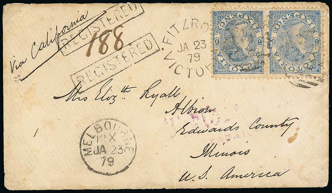 1879 (23 Jan.) envelope from Melbourne to Illinois, marked "Via California", bearing Laureated 6d. pair tied by Fitzroy duplex, showing two strikes of framed "registered" h.s., Melbourne c.d.s. and, on reverse, San Francisco transit d.s. in violet. Photo