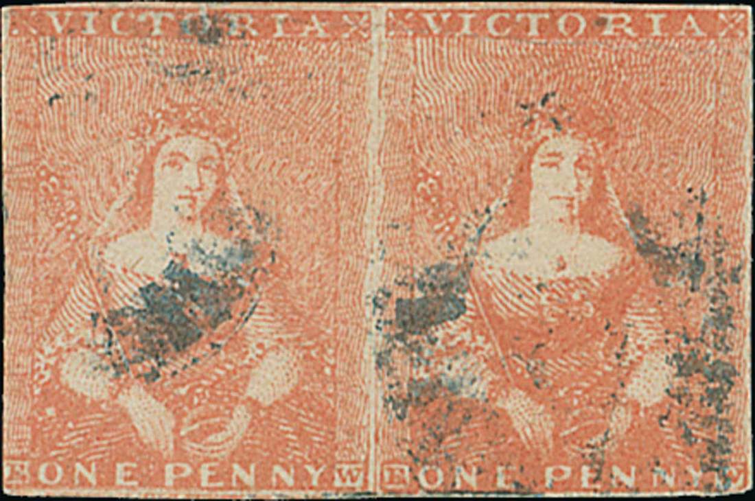 Third state of dies, third printing 1d. orange-vermilion pair, [10-11], good margins for this close setting, indistinctly cancelled, horizontal crease along top not detracting from fine appearance. A rare multiple. S.G. 8, £1300+. Photo