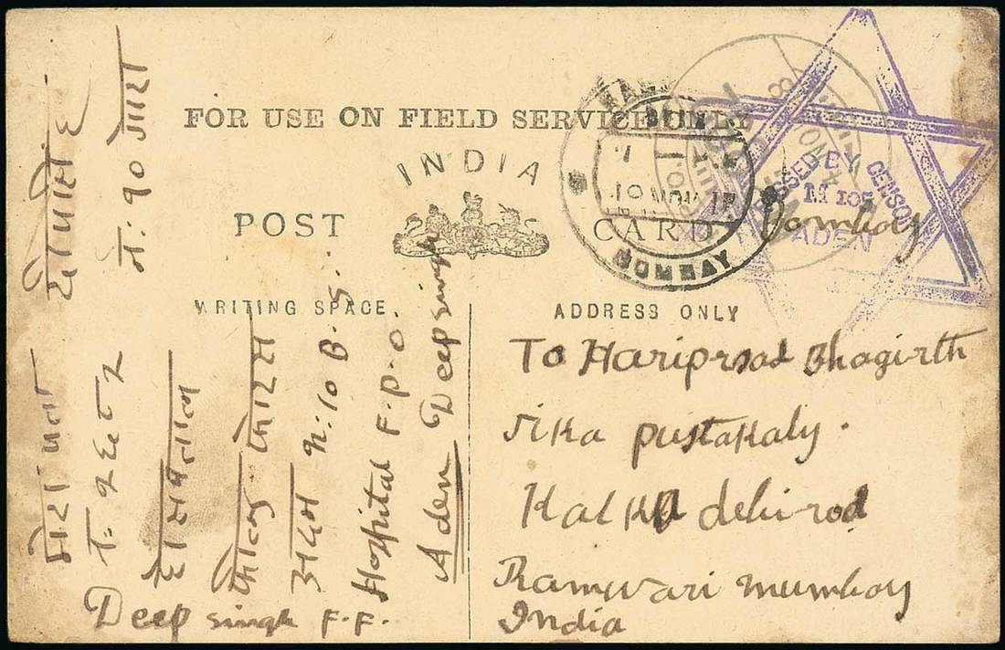 1918 (4 Nov.) Field Service postcard, message written in native script, from F.P.O. 392 at Khormaksar to India, the F.P.O. datestamp over-cancelled by rare Star of David "passed by censor/m 105/aden" handstamp in violet and Bombay arrival datestamp. Photo