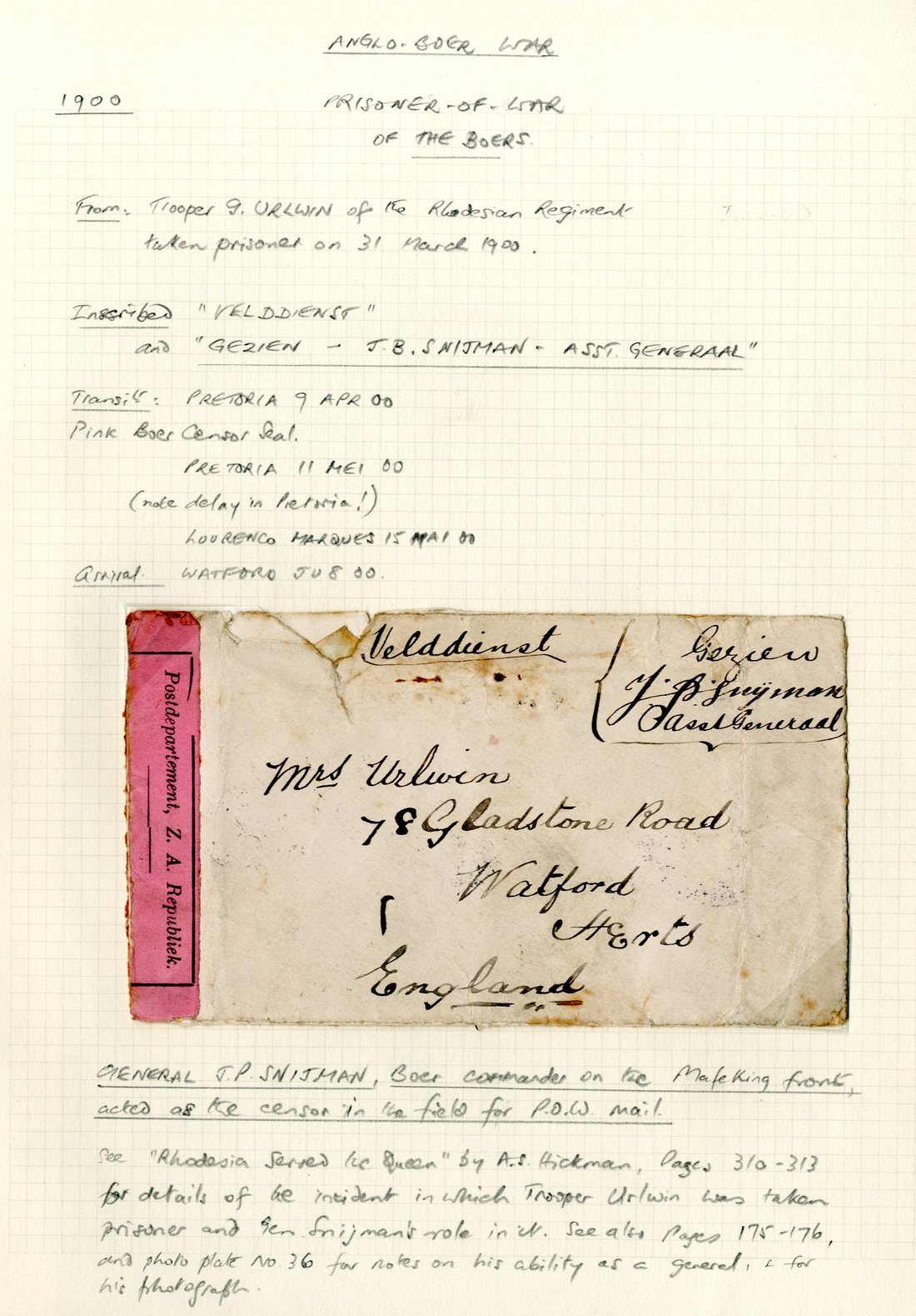 1900 (Mar.) envelopes (2) from Trooper G. Urwin, of "B" Squadron, Col. Plumers Horse to England, the first from him at Crocodile Pools with datestamp (2.4) on face and large "T" handstamp cancelled out by "fb" in circle of bars handstamp, the letter written prior to a skirmish in which Urwin was wounded and taken prisoner near Mafeking on 31 March, and ( Apr.) "Veldienst" envelope to the same addressee whilst he was a prisoner, signed by Boer Commando on the Mafeking front, General J.P. Snijman, with Boer censor label and sent out via Lourenco Marques (15.4); a couple of faults though a most unusual pair