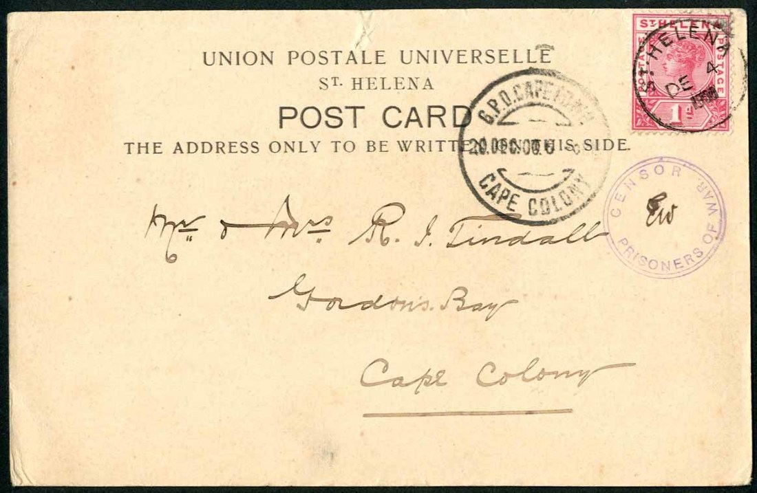 1900 (11 May) envelope to Deadwood, bearing Keyplate 1d. tied by c.d.s. and initialled "FWA" by censor, 1900 (Oct.-Dec.) envelopes (2) and picture postcard to Cape Colony (2) franked at 1d. and to Transvaal at 2½d., each showing circular "censor/prisoners of war" in violet initialled "EW", and 1900 (Oct.) 1d. outward half of reply paid card from Deadwood Camp to Pretoria showing circular "censor/prisoners of war" in violet initialled "FWA". A clean lot