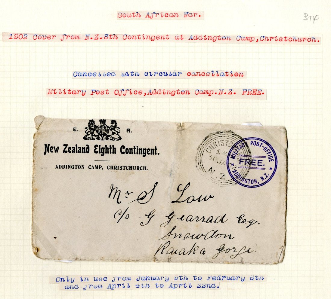 1900 (Sept.) Grand Hotel, Pretoria illustrated envelope from Major Montagu Craddock sent unstamped from Army P.O. 5 to Auckland and redirected to Karangahaki, marked "No Stamps available" and signed by Craddock, showing Auckland datestamp and 1d. To Pay Double Deficient handstamp, and 1902 (Jan.) 8th. Contingent specially printed envelope for use by the South Island regiment based at Addington Camp at Christchurch, addressed to Raika Gorge and with the Camp cachet in violet and Christchurch datestamp, small faults though scarce, being a second period use for only 3 weeks in April