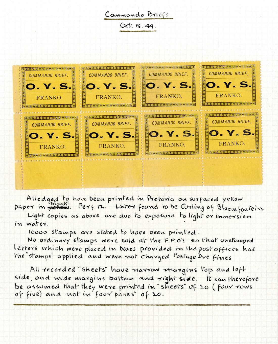 1899 (15 Oct.) Commando Brief (-) black on bistre-yellow, a lower left corner block of eight (4x2), fine unused. S.G. M1, £256