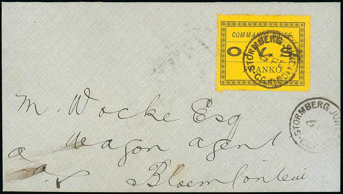 1900 (6 Feb.) envelope from Stormberg Junction to a "Wagon Agent" at Bloemfontein, bearing a fine example with neat datestamp and a further example of the datestamp below, arrival datestamp (8.2) on reverse. Photo