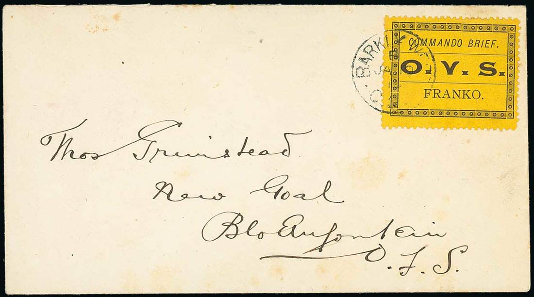 1900 (10 Feb.) envelope from Barkly West to Bloemfontein, bearing a fine example neatly cancelled by datestamp in bluish black ink, arrival datestamp (16.1) on reverse. Photo