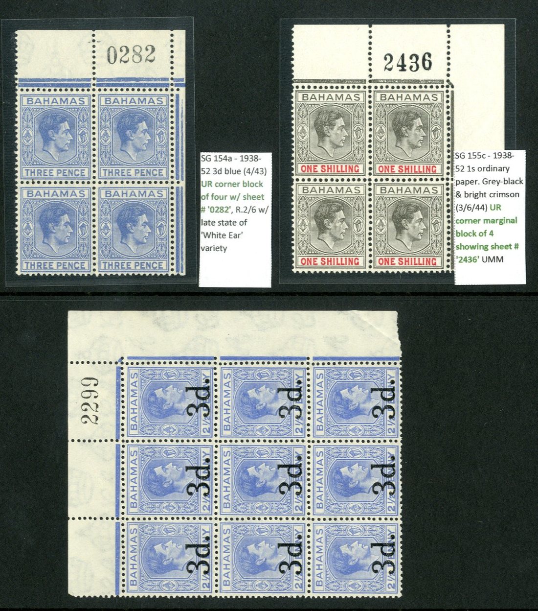 1938-52 1d. carmine, 1½d., 2d. scarlet, 3d. blue and 1/- 1944 printing all in corner blocks of four, 2d. scarlet (2) and 2d. green corner blocks of six (2x3), and 1940 3d. on 2½d. corner block of nine, all from the upper right corner with all but two showing sheet number, 1d. and 3d. blocks with one in each showing "white ear" variety, both 2d. scarlet blocks with one in each showing variety short "T", fine unmounted mint