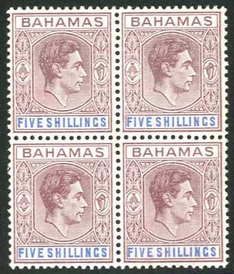 1938-52 5/- dull mauve and deep bright blue April 1948 printing block of four, fresh unmounted mint. S.G. 156d