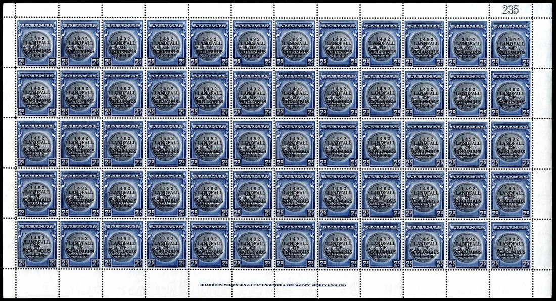 1942 Columbus 2/- brownish black and steel-blue complete sheet of sixty (folded vertically at centre) with sheet number "235", fresh unmounted mint. A very fine and rare multiple. S.G. 172b, £2,520