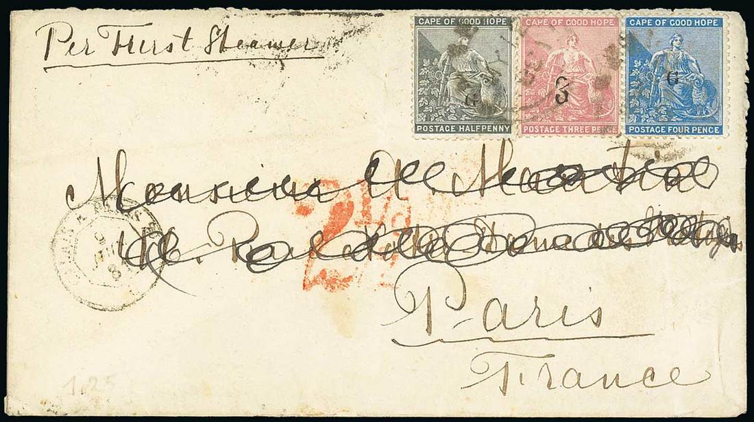 1881 (12 May) envelope from Kimberley "Per First Steamer" to Paris, bearing 1878 Type 15 ½d, 1879 Type 17 4d. and Cape 1880 Type 11 "3" on 3d. pale dull rose showing defective typeface (constant on [56] of the overprint setting) twice cancelled with double-arc datestamps, showing "2½d" accountancy handstamp in red and with Calais-Paris T.P.O. datestamp at left, Cape Town and London (9.6) datestamps on reverse; part of address deleted though not unattractive and an unusual mixed-colony franking carried on the Garth Castle from Cape Town on 17 May. Photo
