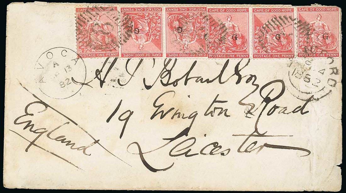 1882 (13 Sept.) envelope from Avoca to England, bearing 1879 Type 17 1d. carmine-red strip of three and a pair (placed inverted) in combination with Cape 1d. carmine-red all cancelled "8" and additionally tied by Avoca c.d.s. and Langford (14.9) transit double-arc datestamp, Cape Town and Leicester (10.10) datestamps on reverse. R.P.S. Certificate (1972) stating that one of the stamps in the strip is Type 15 from a few settings with many varieties which have not been listed. Photo