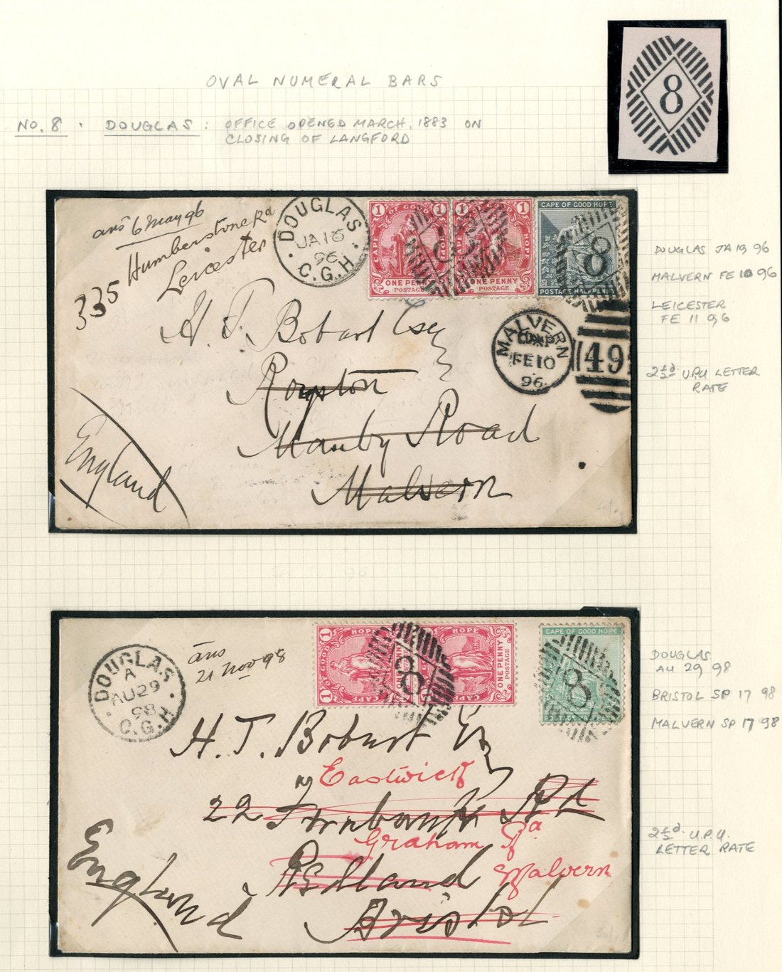 1896 and 1898 envelopes ex the Bobart correspondence from Douglas to Malvern and Bristol respectively and both redirected, one bearing ½d. grey and 1d. red pair, the other with ½d. green and d. red pair, all cancelled "8" with despatch datestamp alongside, the first with Malvern large part duplex at right; an unusual pair from what was formerly the office of Langford