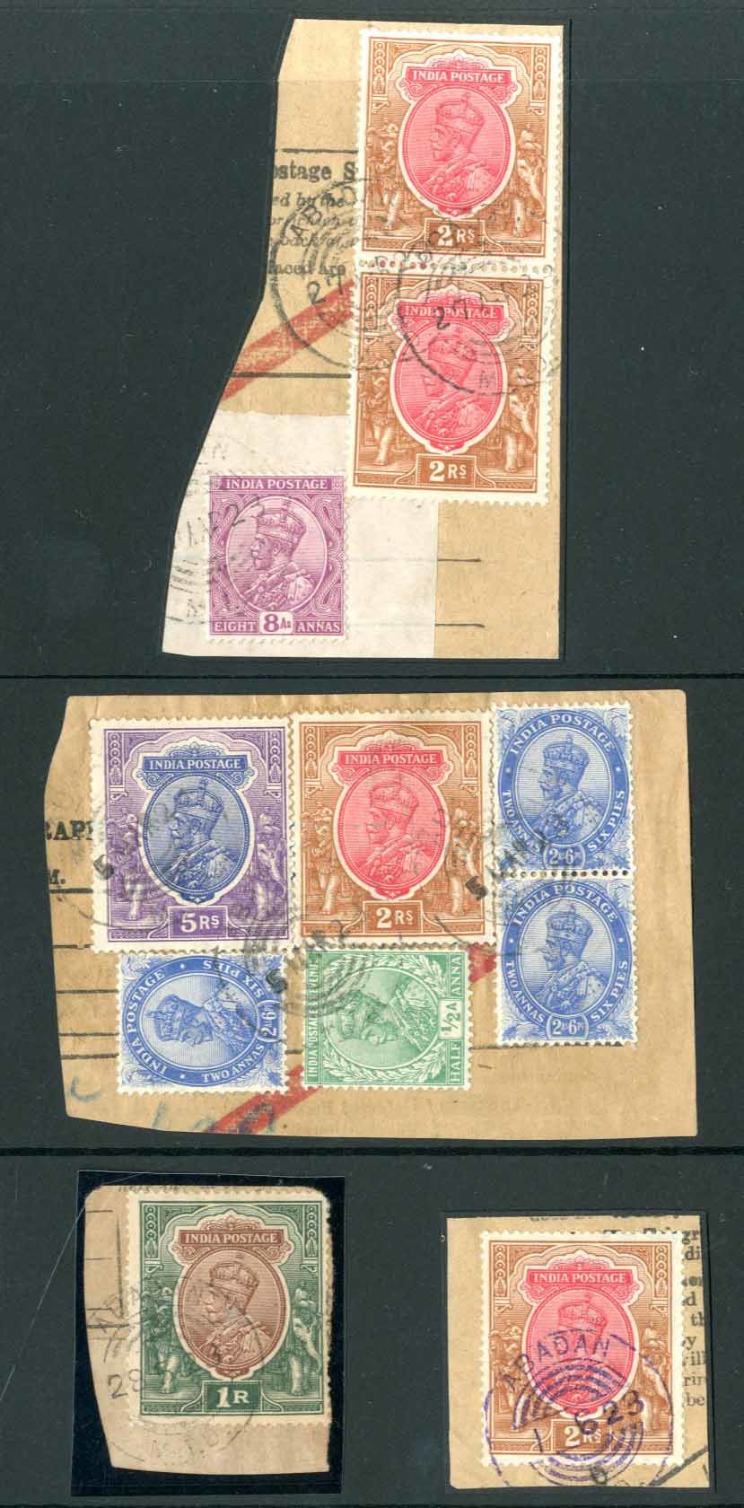 Collection of KGV India issues used in Kuwait, including 1a., 2a. blocks of four and pieces (5) some with combination frankings Mohammerah, including scarce "mohammerah/ i.e.f.d. telegraphs" cancellation, and Abadan, four pieces, two with combination frankings and another with 1r. cancelled in violet. A scarce group showing unusual usage.