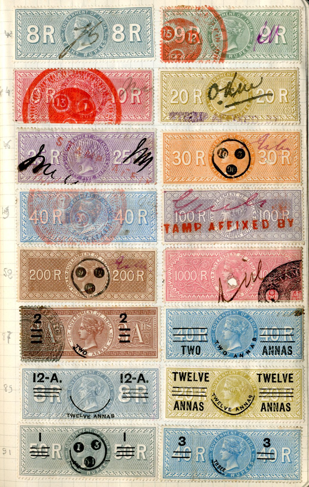 1860-1915 old-time unpicked collection neatly mounted in exercise book, including a myriad of provisionals and overprints (many unlisted), with Court fees overprints on Electric Telegraphs issues, and early postage types including Service, Foreign Bills including embossed surcharges and Specimen overprints, 1898-1904 provisional surcharges, local court overprints including High Court, Notarial, Petitions, Calcutta, Special Adhesive issues to 1000r. (scarce), also a superb collection of Indian States including rare early primitive issues from Bikaner (16), Bhopal, Cooch Behar, Coutch, Faridkot, Idar, Sirmoor, Rajkot, and many more not mentioned, with numerous provisionals, surcharges overprints etc. A marvellous intact old-time lot which has not been on the market for almost 100 years. (hundreds)