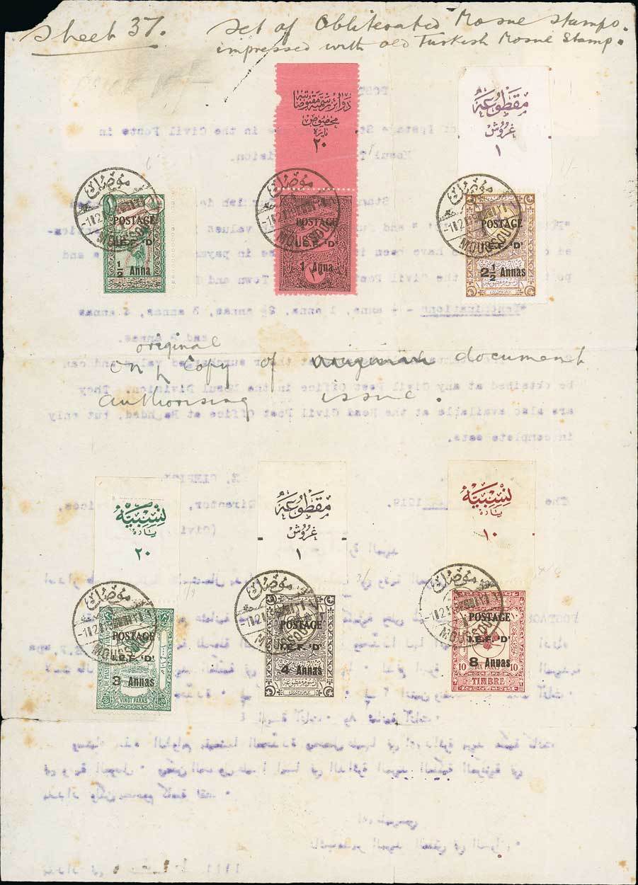 1919 bilingual Postal Notice announcing the "Issue of Postage Stamps for use in the Civil Poste in Mosul Town and Division", bearing on reverse the six surcharged values (all except the ½a. on 1pi.) from the top of the sheet with Turkish inscription, Mussoul 1.2.19 cancellations; the notice with some faults; rare. Photo
