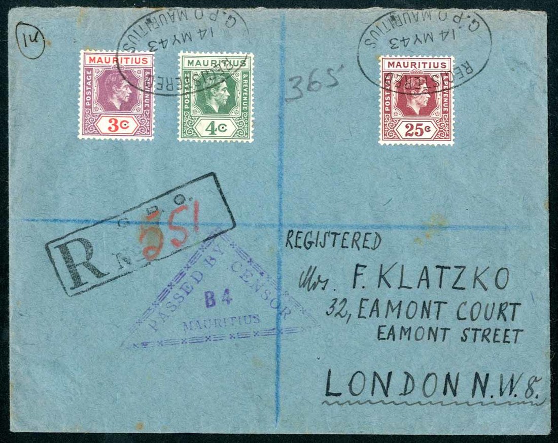 1943 (14 May) envelope registered to London from the Mauritius detention camp, franked 1938 3c., 4c. and 25c., violet triangular "passed by /censor/mauritius/b4" cachet; traces of staining and each stamp with a small pen mark in the "c" of the value; scarce