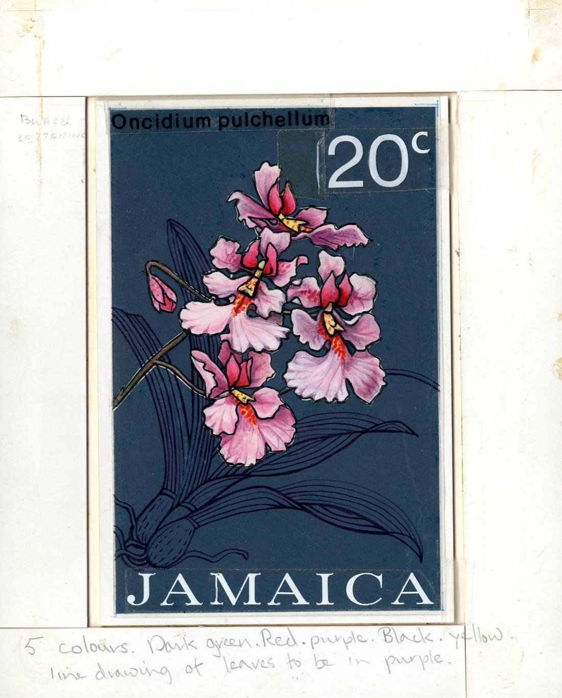 1973 Orchids issue, composite essay for the 20c. value hand painted design by Sylvia Goaman overlaid with inscription, value and country name in acetate, mounted in card frame. Attractive and unique.