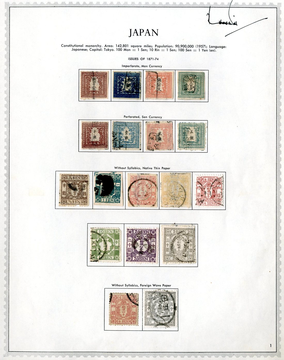 1874-1960 mint and used collection housed in two albums contained in a carton, including a range of first type forgeries, 1899-1908 5y., 10y., 1910 Military Frank 3s., 1915 Coronation set, 1919 Peace, 1923 Earthquake set, 1929-34 Air set, 1938 Nikko, 1940 Daisetsu-zan, 1940 Kirishima and 1941 Daiton Park miniature sheets, 1948 Philatelic Week 5y., 1949 Communications miniature sheet, 1949 Athletics block, 1949 Postal Week 8y., 1952 Chubu-Sangaku miniature sheet, later issues, Post Offices in China, Occupations, Revenues, etc., mixed condition