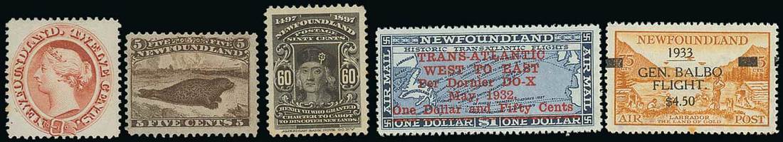 1865-1947 mint collection including 1865-71 yellowish paper 5c., 13c., 24c. and white paper 2c., 10c. and 12c., 1868-73 perf. 12 1c., 3c. vermilion (2), 3c. blue, 5c. and 6c., 1876-79 rouletted 1c., 2c., 3c. and 5c., 1880-82 1c., 2c., 3c. and 5c., 1887-88 2c., 3c. and 10c., 1897 Discovery set, 1897-1918 ½c. to 5c., 1897 1c. Type 36 on 3c., 1910-11 litho and engraved sets, 1911-16 Coronation set, 1919 1c. to 36c., 1919 (June) Air $1 on 35c. (2, one with no comma after "air post"), 1921 (Nov.) Air 22¾mm. setting 35c. with no stop after "1921", 1923-26 1c. to 24c., 1928-29 Publicity 1c. to 30c., 1929-31 1c. to 20c., 1931 Air set with and without watermark, 1931 1c. to 30c., 1932 Air DO-X $1,50 on $1, 1933 Air 5c. to 75c., 1933 Balbo $4.50 on 75c., and 1933 Gilbert set; some of the earlier issues with gum disturbed/regummed and a few small fox marks though the later issues are generally fine. Cat. £8,215. (232). Photo