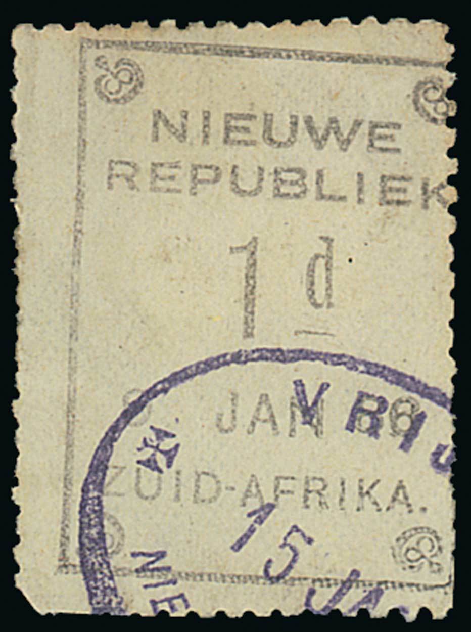 1886-87 without Arms, yellow paper 1d. black cancelled by part Vrijheid oval datestamp dated 15 January, lower left corner rounded and with some perforation faults, otherwise fine. Very rare. S.G. 1, £3000. Photo