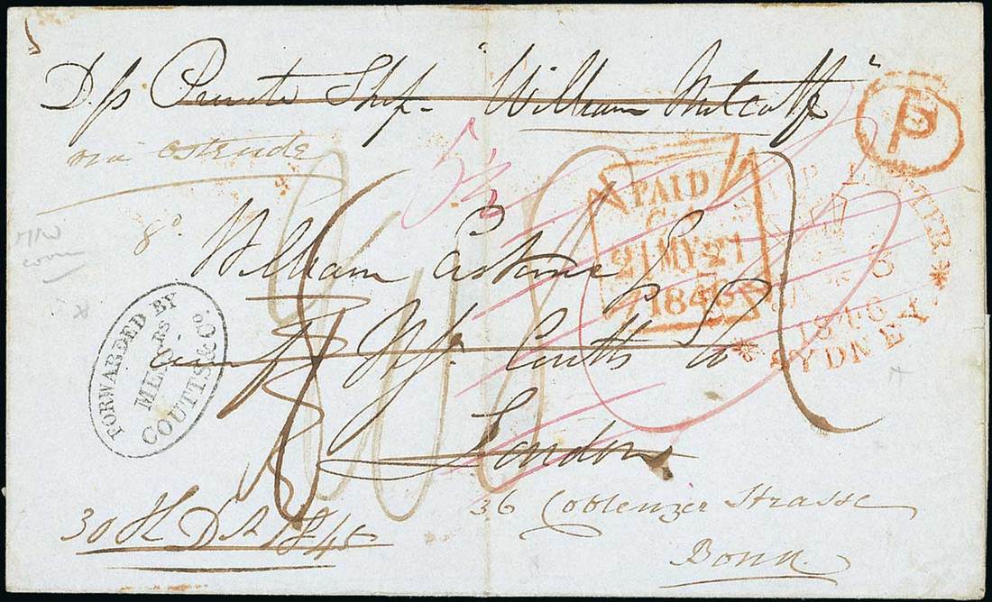 1846 (8 Jan.) entire from Sydney to London and re-addressed to Bonn (Prussia), marked "p. William Metcalfe", rated "3" in red and "8" and showing "paid ship letter/sydney" oval d.s.; upon arrival in London, forwarded by Coutts & Co (cachet at left), marked "via Ostende" and re-rated "20" (decimes) and "5½" (groschen). Most interesting and full of character. The second earliest recorded cover from the Australian Colonies to Germany. Photo