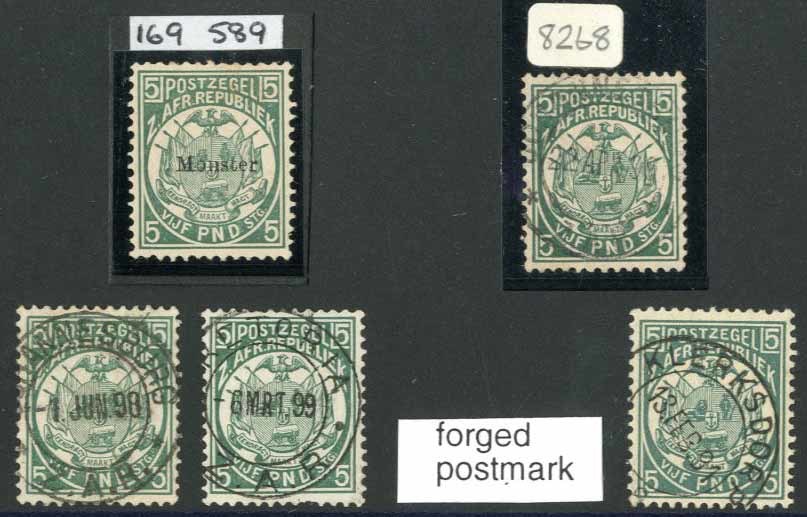 1885-93 £5 green, five examples, the first overprinted 'Monster' (Specimen), with R.P.S. certificate (1997), three used singles, one with P.F.S.A. certificate (1985) which mentions a thin, the fifth a forgery with a postmark pre-dating the issue date(!)