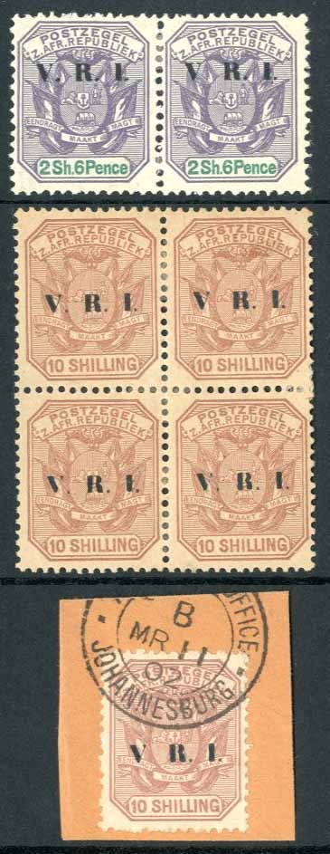 1900 V.R.I. surcharges, fine mint and used collection of varieties (71) on stock sheets including group of double overprints (8) three of which are identified as forgeries, also "no dot after I" ½d. (2), 1d. (9), 2d. (defective), 2½d. (6, including block of four), 3d. strip of three, also large group of blocks and multiples of the various "No dot" varieties, including "No dot after V" 10/- pale chestnut in mint block of four, with P.F. cert (1997). A fine lot for the specialist.