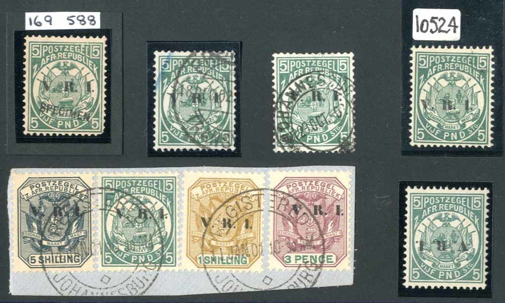 1900 overprinted V.R.I. £5 green selection (6) including used single fine used with Holombe cert (1986), another handstamped specimen  [54] with R.P.S certificate (1997), toned, the remaining four convincing forgeries including a single with inverted overprint and another 'used' on combination franking piece. S.G. £800+