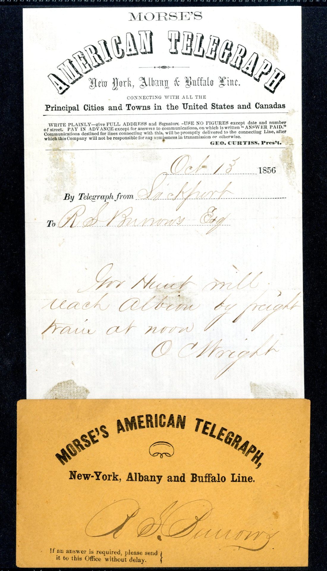 1848-59 Collection of early telegraph forms (42), many with accompanying envelopes or enclosures, the earliest 1848 Magnetic Telegraph Office, 2849, 'Morse's Telegraph Office, New Orleans and Ohio line', 1850 (2) including 'Atlantic and Ohio' and 'O'Rielly's Atlantic' companies. Many attractive forms with ornate illustrated headers, embossed envelopes etc. An unusual and attractive group.