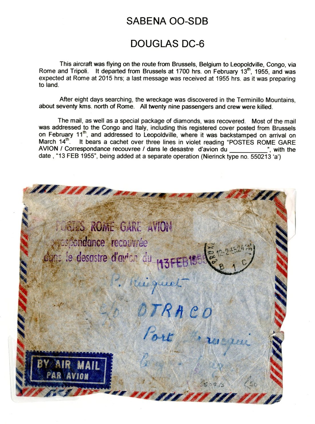 1917-68 collection of forty-six covers airmail crash and ambulance covers, informatively written up with notes, photographs and press cuttings, housed in three ring binders, contained in a carton, including 1924 (1 Oct.) Estevan-Winnipeg flight souvenir envelope, 1931 (26 Nov.) Australia-Great Britain flight, 1932 (29 Jan.) Cape Town-London ("City of Basra" and "City of Delphi" crashes), 1936 (22 Aug.) "Scipio", 1937 (5 Dec.) "Cygnus", 1939 (1 May) "Challenger", 1939 (11 Aug.) Luxeuil-Bains, 1939 (15 Aug.) Great Britain-Sweden, 1948 (13 May) Belgian Congo-Belgium, 1954 (13 March) Australia-Great Britain, 1954 (3 Aug.) Paris-New York, 1954 (25 Dec.) London-New York, 1955 (13 Feb.) Brussels-Leopoldville, 1955 (27 July) London-Istanbul, 1961 (15 Feb.) New York-Brussels, etc., mixed condition as would be expected but a fascinating lot