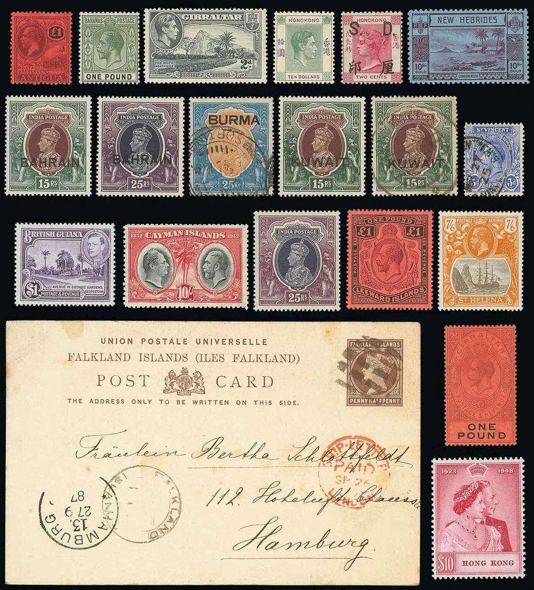 A British Empire collection in various stockbooks, two-ring binders, pages and loose in packets, etc., including Atlantic Islands comprise Ascension with 1924-33 values to 3/- mint and used, 1934, 1938-53, 1956 and 1963 sets mint; Bermuda with a range of QV, KGV to 2/6d., KGV keyplates 2/- (8), 2/6d. (5), 5/- (4), 10/- (5), 12/6d. (4) and £1 (3) mint, 1953-62 set mint and used, and Falkland Islands with a few QV, KGV with 1932 Centenary set to 1/- mint, 1938-50 and 1952 sets mint, 1960-66 set mint and used, some Dependencies, and St. Helena with Badge issue values to 7/6d; Europe with Cyprus KGVI and QE sets to £1 and 1960-61 set with 15m. olive-green and indigo; Gibraltar with KGV values to £1 1938-51 values to £1 with 2d. grey perf. 13½ watermark sideways, 1953-59 and 1960-62 sets mint, and Malta with sets and part sets, West Indies with better sections of Antigua with 1921-29 values to £1 mint, 1938-51 and 1953-62 sets mint; Bahamas with 1921-37, 1938-52, 1942, 1948 and 1954-63 sets mint; Barbados, British Guiana; with 1938-52 range including perf. 14x13 $1 mint; Cayman Islands with 1908 set, 1921-27 values to 10/-, 1932, 1935, 1938-48, 1950, 1953-62 and 1962-64 sets; Dominica; Grenada; Jamaica; Leeward Islands 1921-32 set to £1, 1938-51 set to 5/-, 10/- (2) and £1 (4) mint; Montserrat; St. Kitts-Nevis with 1923 set to 5/- mint; St. Lucia; St. Vincent with a range of QV values to 1/- 1921-32 3d. bright blue with reversed watermark; Trinidad and Tobago with 1922-28 set mint; Turks and Caicos Islands, and Virgin Islands; Asia with ranges of Bahrain 1938-41 set mint; Brunei; Burma 1937 values to 10r. mint, 15r. and 25r. used; and 1938-40 set mint; Hong Kong with a selection of QV, KGV values to $3, 1938-52 set mint, 1954-62 set and Postal Fiscal 1891 "s.d." 2c., mint; India with some QV, KEVII values to 10r. used, KGV mint to 5r. and used to 15r., KGVI set to 25r. mint and a few Officials, Kuwait 1939 set mint and used; Malaya and States, North Borneo and Sarawak; Australasia includes a range of Australian States; Australian Commonwealth and Dependencies with New Guinea, Papua and Papua New Guinea; British Solomon Islands with Postage Due set mint; Fiji; Gilbert and Ellice Islands; Nauru with 1916-23 sets of eleven and four and 1924-48 sets, mint; New Hebrides with 1938 set and Postage Dues complete mint; New Zealand with a few Chalons, Sidefaces with a few adverts, Pictorials to 5/-, a good range of later issues and Dependencies; Pitcairn Islands; Silver Wedding sets are offered throughout; and a range of covers in three four-ring binders including Australian States with two bearing Half-Lengths internal at 4d. and to England at 6d., Falkland Islands 1887 1½d. commercially card with cork (Early Football) cancellation to Hamburg a few South African States, South Africa 1919 Make Your Sixpence Fly Aerial postcard used to Cape Town. Photo