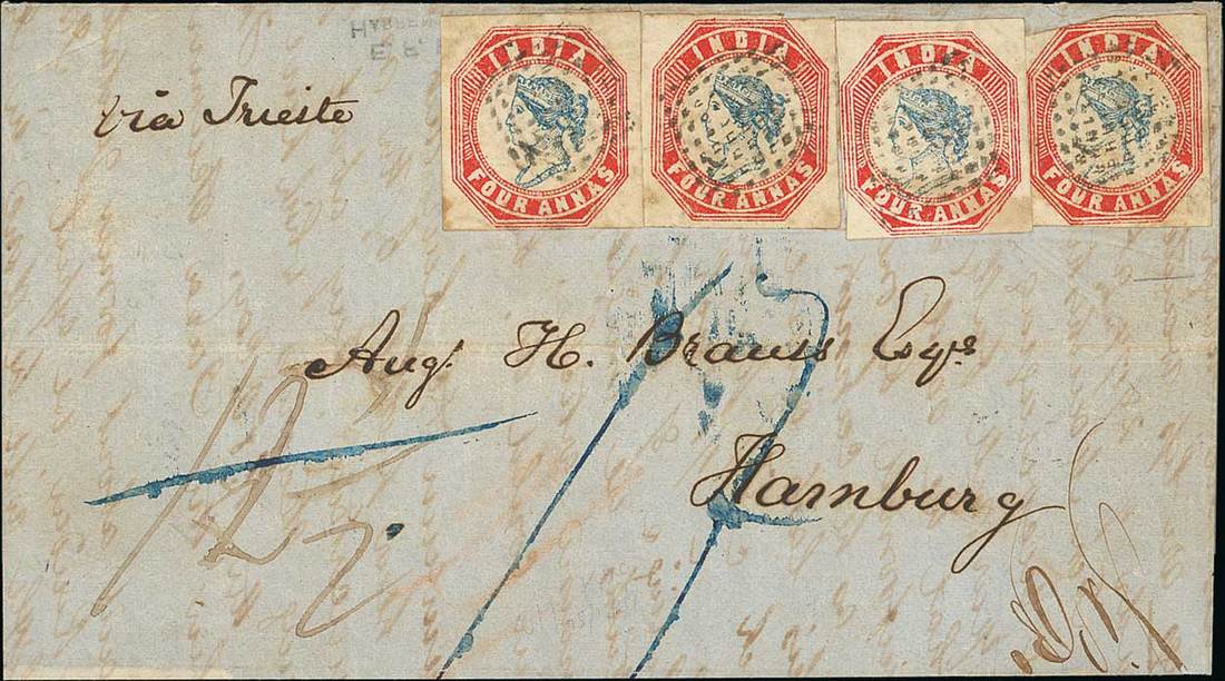 1856 (19 Jan.) entire from Singapore to Hamburg, marked "via Trieste", bearing 4a. 4th printing (4, all cut square, mostly with clear margins and some with light staining), each cancelled by diamond of dots, showing manuscript "12½" Prussian Silbergroschen (deleted) and "17" Schilling (local currency) in blue ink and, on reverse, clear arrival datestamp (1.3). A very rare and outstanding franking. Heddergott Certificate (2002). Photo