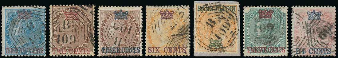 1867 (1 Sept.) 1½c. on ½a., 2c. on 1a., 3c. on 1a. (ex Charles Taylor), 6c. on 2a., 8c. on 2a., 12c. on 4a. and 24c. on 8a. (slightly faded), each cancelled "B/109"; also 8c. on 2a. (slightly faded) cancelled by part Malacca c.d.s.; condition generally fine. A rare group. Cat. £1149+. Photo