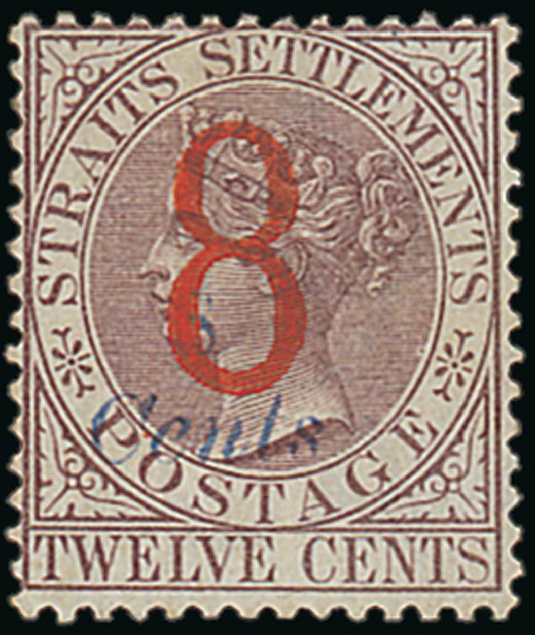 1884 (Sept.) "8" in red on "8/Cents" on 12c. dull purple with surcharge in blue, unused with large part original gum (disturbed), slight gum thinning at top not affecting fine appearance. Rare. R.P.S. Certificate (1992). S.G. 80b, £11,000. Photo