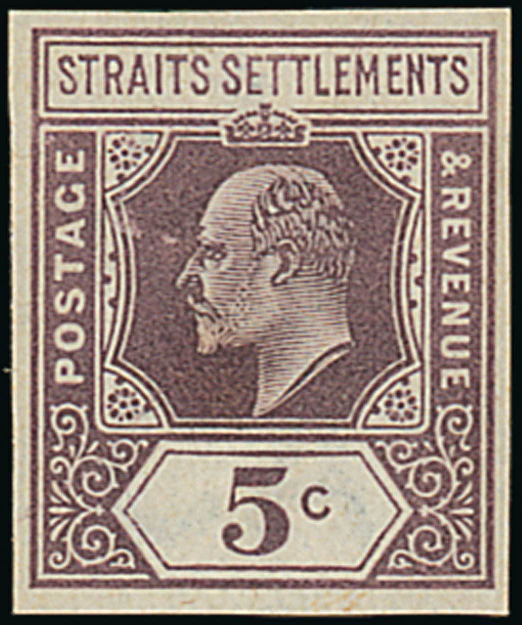 5c. in dull purple and brown on gummed watermarked paper, two tiny marks in front of King's face. Photo
