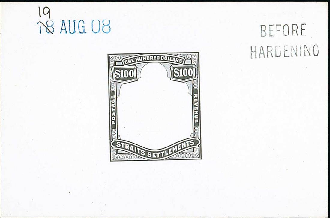 $100 frame only in black on glazed card (92x60mm.) marked "before hardening" and dated "18 aug 08" with the day changed in manuscript to "19", fine. Photo