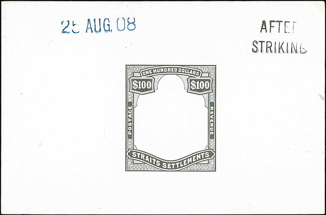$100 frame only in black on glazed card (92x60mm.) marked "after striking" and dated "25 aug 08", fine. Photo