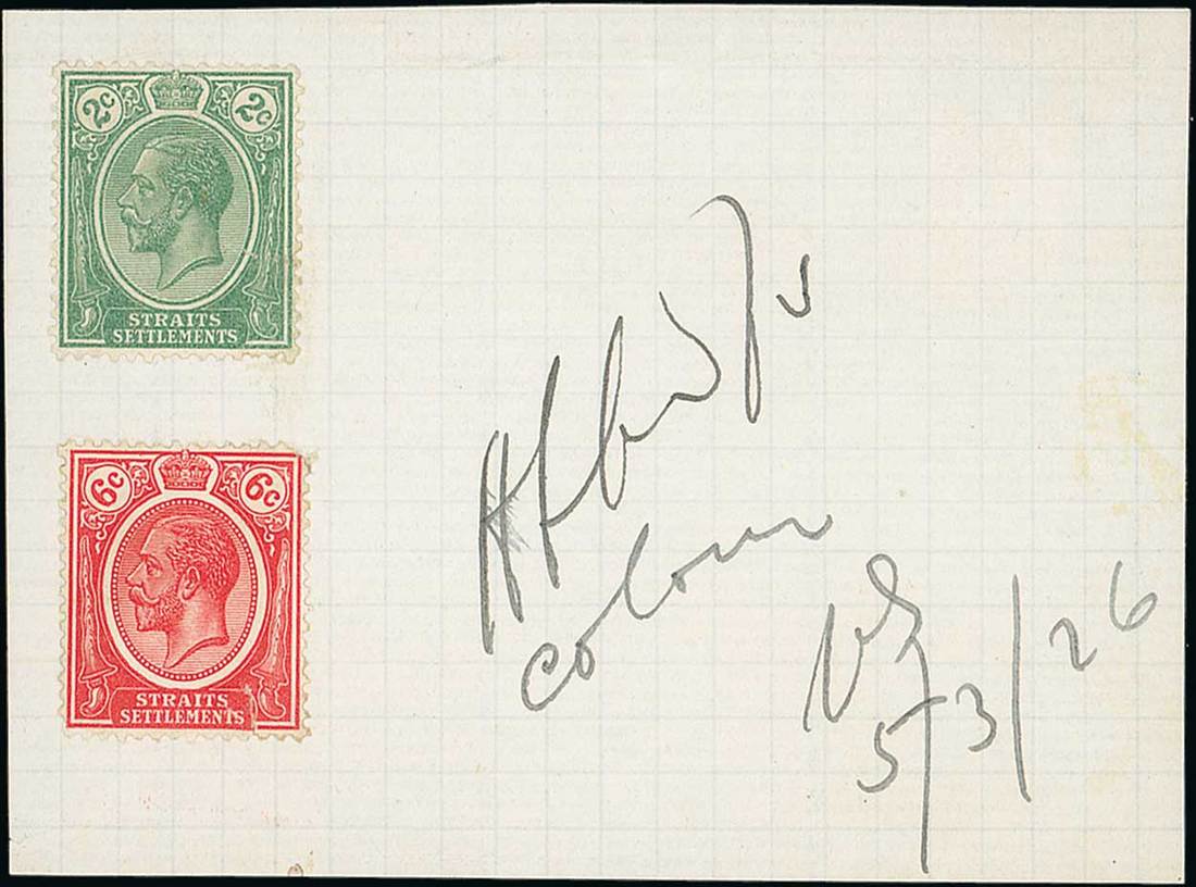 2c. in green and 6c. in scarlet afrfixed to piece of paper (97x72mm.) marked "Appd for colour", initialled and dated "5/3/26", fine. Photo