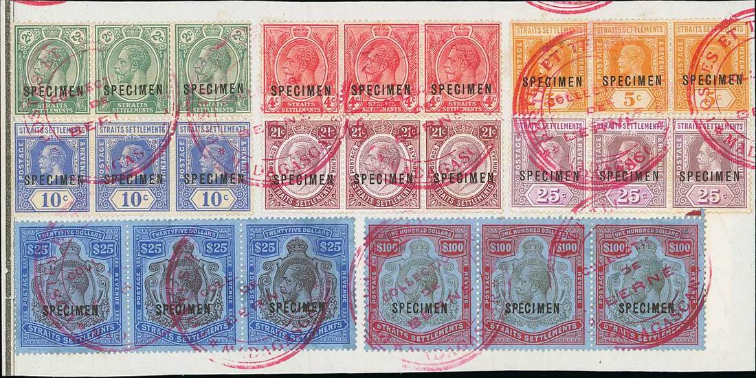 2c. green, 4c. carmine-red, 5c. orange Die I, 10c. bright blue, 21c., 25c., $25 and $100, each in a horizontal strip of three overprinted "specimen", affixed to piece and cancelled by red "postes et télégraphes/collection de berne/madagascar" circular handstamp, very fine. A rare and most attractive piece. Photo