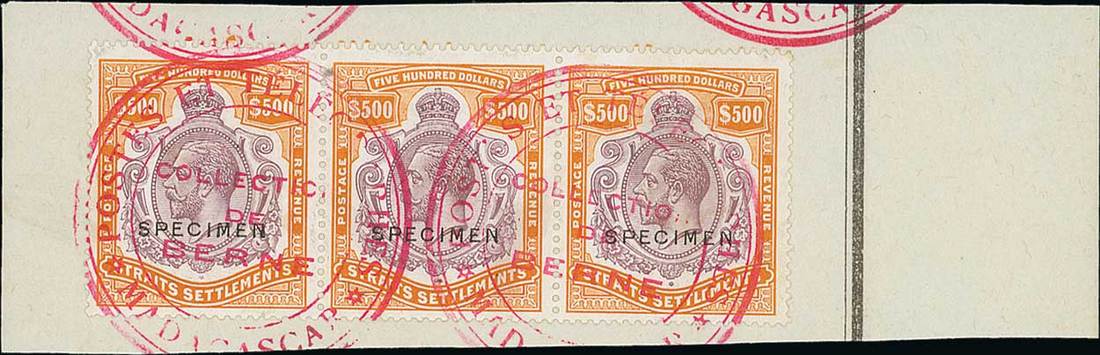 $500 purple and orange-brown, a strip of three [10-12] with [12] showing "break in scroll", each overprinted "specimen" and affixed to piece cancelled by red "postes et télégraphes/collection de berne/madagascar" circular cachet. Extremely rare, only six of this flaw can exist. S.G. 240d/da. Photo