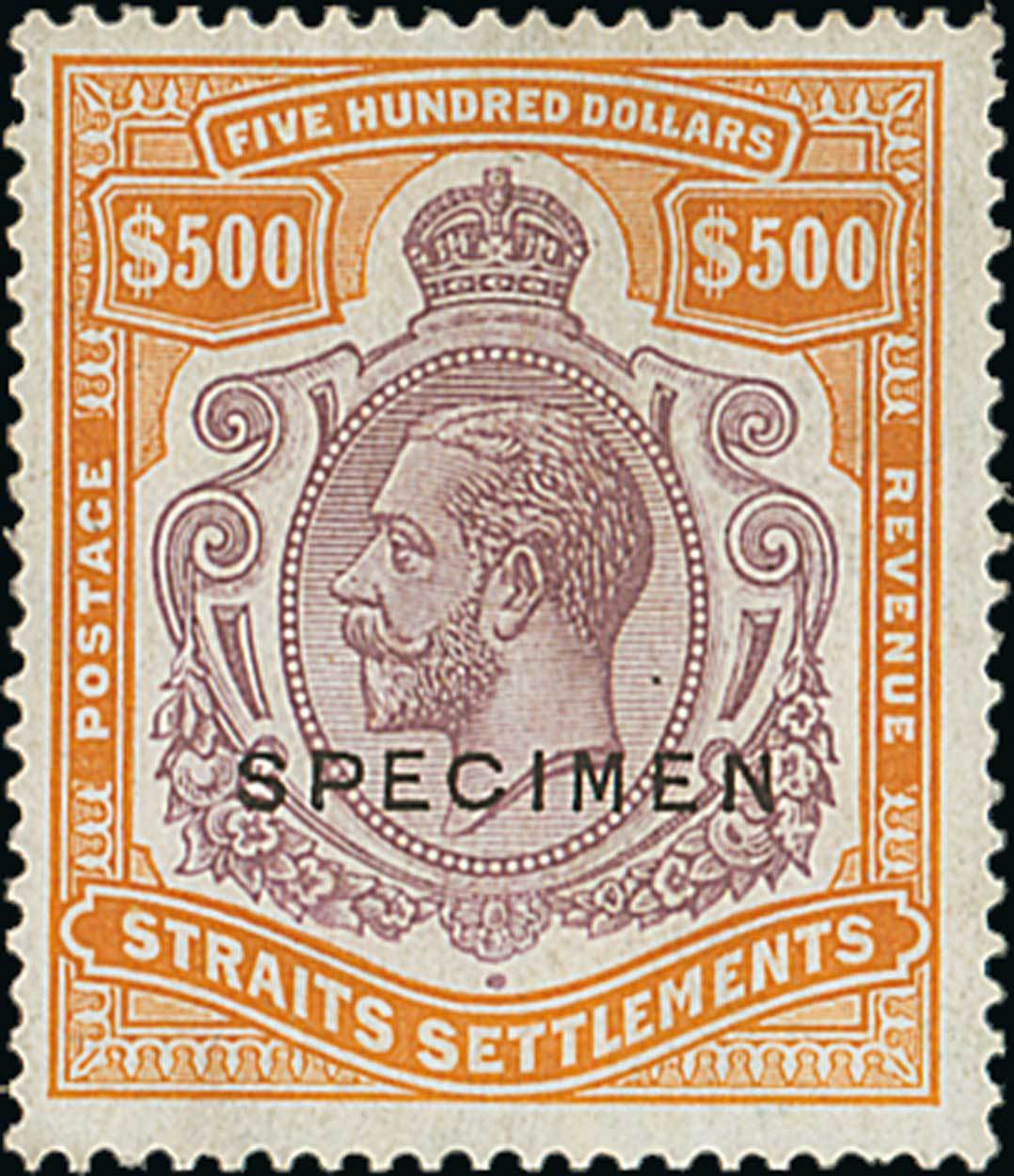 $500 purple and orange-brown showing "damaged leaf at bottom right", overprinted "specimen", fine mint. Extremely rare, only six of this variety can exist. S.G. 240df. Photo