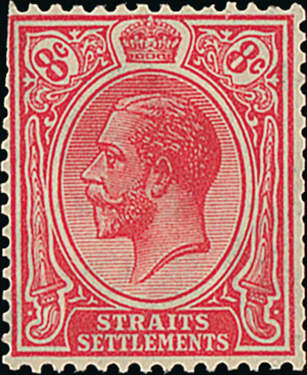 8c. carmine, unused with large part original gum, small internal crease and some clipped perfs at top left and at right, otherwise fine. Extremely rare, one of two recorded examples. S.G. 240e, unpriced. Photo