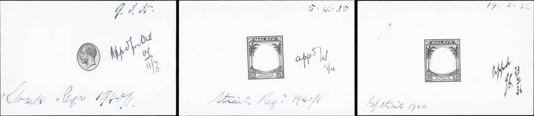 1936-37 1c. to $5 set of fourteen (no 4c.) frame die proofs together with the head in oval surround and $1, $2 and $5 essay types with dollar symbol after the value, each in black on glazed card (92x60mm.) dated between "15.3.35" and "19.2.36", each marked "Straits Reqn. 1940/1" and variously approved; three with paper clip indentations (one rusty) clear of the design. A unique set. Photo