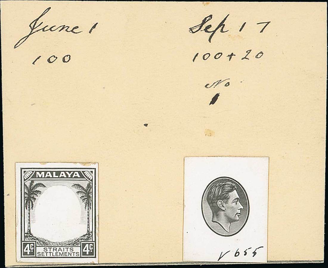 Head die proof in oval surround and 4c. Die I frame die proof, both stamp-size in black on glazed card and affixed to De La Rue day book piece with dates and details of leads taken, the head proof marked "V655" at foot. Photo