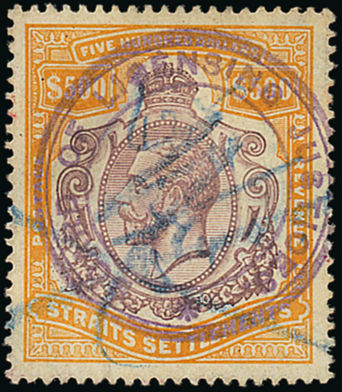 1912-23 MCA $500 purple and orange-brown, cancelled by blue crayon and "licensing justice singapore" circular cachet, fine. S.G. 215, £600. Photo