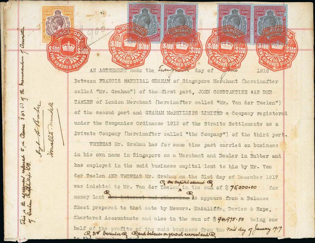 1918 (18 July) commercial loan document, bearing 1912 MCA $100 black and carmine on blue (4, three with minor surface abrasions) and $500 purple and orange-brown, all tied by Singapore red embossed datestamps. Very rare, one of the few recorded examples of the MCA $500 on document. Photo